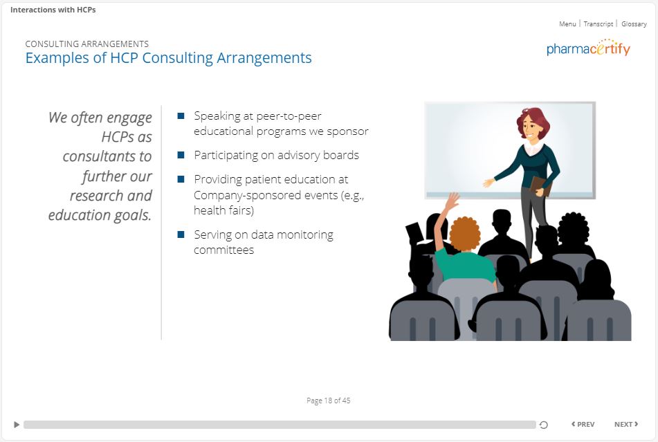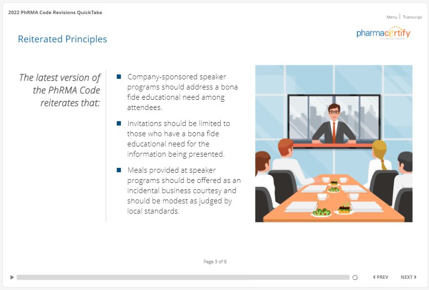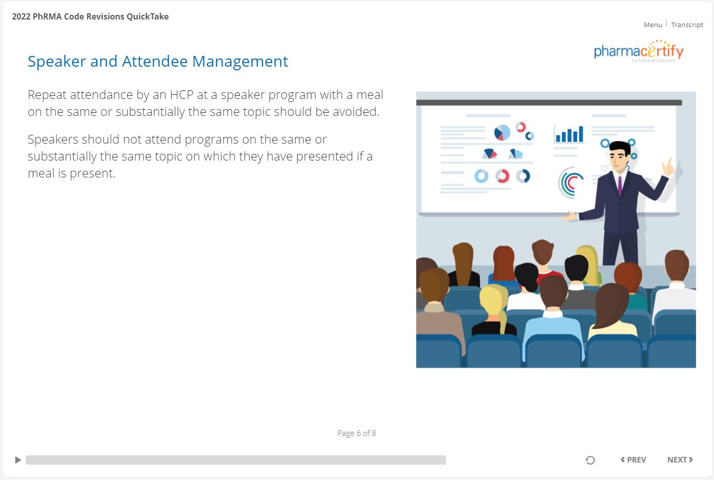 Speaker programs remain a hot topic for enforcement, and as the industry emerges from the pandemic, your learners need refresher training on the foundational rules of compliant speaker programs and the key concepts associated with those programs. We can help, with our recently updated PharmaCertify Foundations eLearning module, Managing Speaker Program Risk.