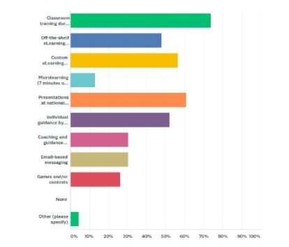 Complying with laws and regulations is still a priority for the industry. In fact, 86% chose it as one of their three answers when asked what training objectives are most important to them. 82% added “build or strengthen our culture of compliance” and 55% selected “reduce field compliance risk.” We’re particularly excited to see those last two answers score so high since our stated mission has long been to “help life sciences companies strengthen their compliance cultures and reduce risk” through innovative training.