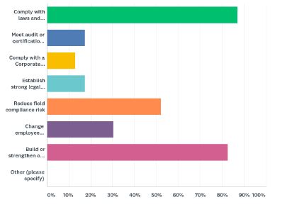 Over 95% of the survey respondents selected “enhancing our training” when asked which compliance activities they plan to undertake in the next twelve months. Clearly, your peers are aware of the need for up-to-date and modern training. That’s exciting! Over the last ten years, we’ve watched compliance training evolve, from its beginning in PowerPoint presentations delivered by legal departments, to today’s environment, where trainers realize that a blended, continuous approach using a mix of components is most effective. As we heard at this year’s Life Science Compliance Training Conference in Chicago, tools like microlearning, workshops, storytelling, and gamification are needed to make the training stick. Other choices that finished high in the 12-month activities category include “enhancing the overall effective of our compliance program” at 68%, “rewriting policies and/or Code of Conduct” at 64%, “increasing senior leadership and board involvement” at 36% and “conducting a risk assessment” at 32%.