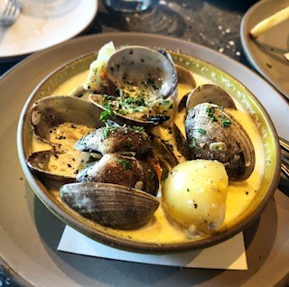 The Hog Island Oyster Company is nestled in the Ferry Building Marketplace, where you can watch the ferries come and go as you enjoy freshly-shucked oysters on the half shell. Choose oysters from various locations or order a dozen or two to try them all! They all come with a fresh vinaigrette or cocktail sauce if you so desire. While their main stake is oysters, the rest of the menu is not neglected. The chowder comes stacked with clams in a nice cream base with veggies, potatoes, bacon and cheese! And the fish sliders are perfectly crispy paired with a tangy coleslaw that compliments the fish nicely. From the bar, the Chardonnay from Napa was crisp and light, and the Wolfback Ridge IPA was a perfect pairing for the fish sliders.