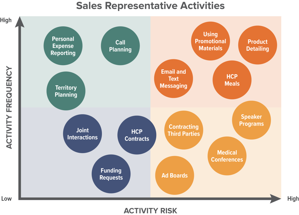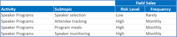 For example, sales representatives may call on doctors almost every day. It’s a high-risk activity, but repetition breeds familiarity. However, the same sales representatives may only occasionally plan and host a speaker program. So, a quick reference guide or refresher training to remind them of their responsibilities would be helpful.