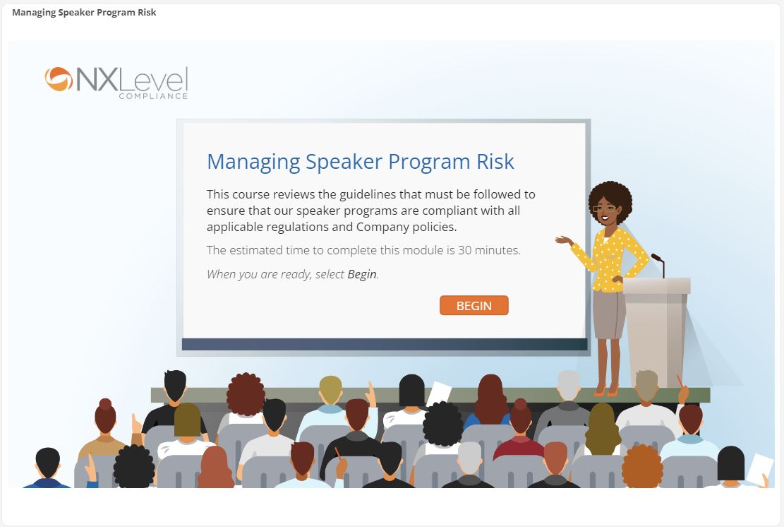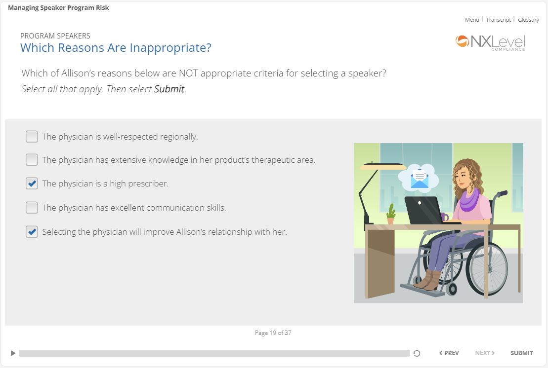 Multiple reasons. From a look and feel standpoint, they add more personality. The characters we use give the training a more light-hearted look, which goes back to my previous point about changing the perception of compliance training. I also recommend the use of illustrated characters because of the flexibility. It’s so much easier to find images that support the key messages and modifying them to fit the content is much simpler.